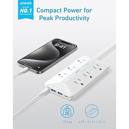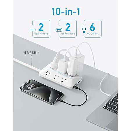 [Prime] $19.99* | 5' 10-in-1 Anker Flat Plug Power Strip w/ 6 AC, 2 USB-A & 2 USB-C (Black or White) at Amazon