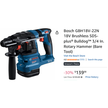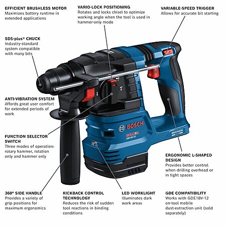 Bosch GBH18V-22N 18V Brushless SDS-plus® Bulldog™ 3/4 In. Rotary Hammer (Bare Tool) $139