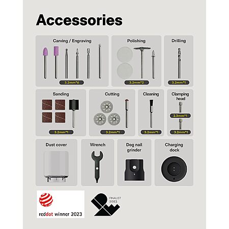 - Accessories for DIY, Crafting & Light Pet Grooming: Includes 35 practical accessories for sanding, polishing, carving, drilling, and cutting, plus a pet nail grinding attachment for gentle nail smoothing. Dual collet support (3.2mm with 2.3mm adapter) works with most common rotary tool accessories.