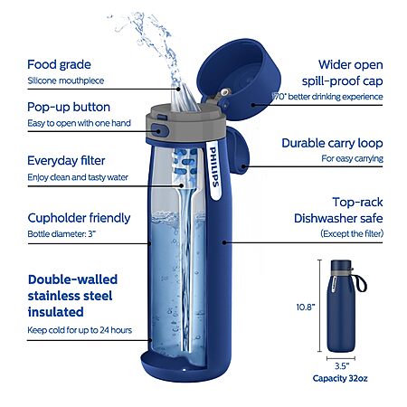 $18.69*:PHILIPS 32oz Water Bottle with Filter (Navy Blue-Stainless) at Amazon