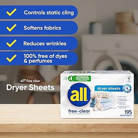 [SnS] $6.17* | 195-Count all Free Clear Fabric Softener Dryer Sheets for Sensitive Skin at Amazon