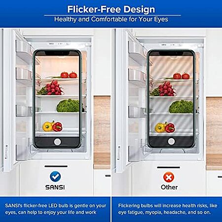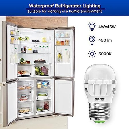 Model: SANSI LED Refrigerator Light Bulb 45W Equivalent, 5000K Daylight White 450 Lumen 4W Appliance Light Bulb A11 Small LED Light Bulb, E26 Freezer Home Light Bulbs, Waterproof, Non-Dimmable, 4-Pack