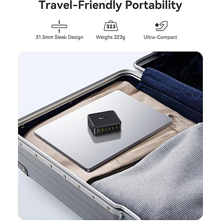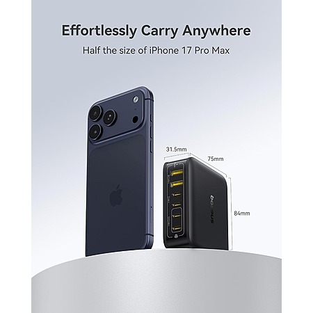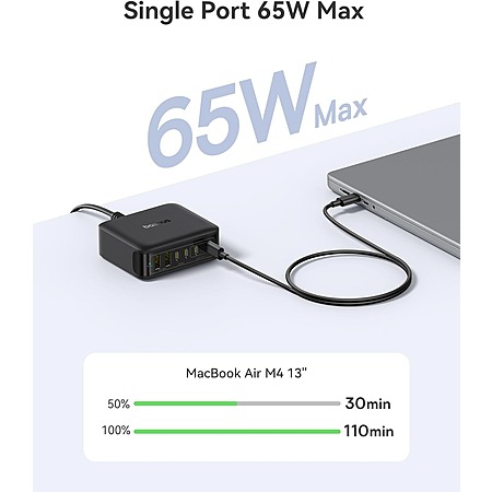 • 120W total fast charging: 65W single-port output charges MacBook Air M4 to 50% in 30 minutes or fully in 110 minutes; supports PD3.0 and dual-port simultaneous fast charging
