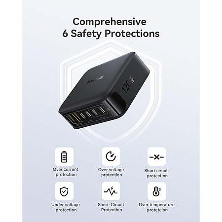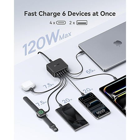 Model: Baseus Charging Station 120W, 6-in-1 USB-C PD Fast Charging Desktop Charger with 5ft Extension Cord, 4 USB C, 2 USB A Ports, Travel Power Strip for iPhone 17/16, iPad Pro, MacBook Pro, Tablet and More