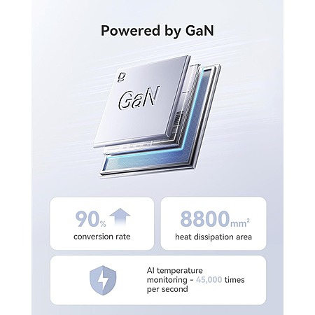 • Safe GaN technology: AI temperature monitoring (45,000×/hour), 90% energy conversion, 8800mm² heat dissipation area; includes 6 built-in protections