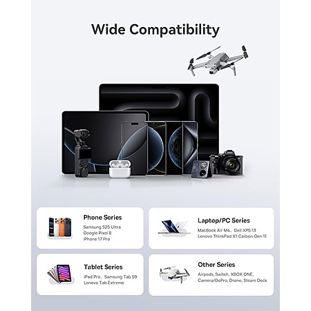 • Ultra-wide compatibility: Supports PD3.0, QC3.0, PPS, and more; works with MacBook, iPad, iPhone, Samsung Galaxy, Google Pixel, Nintendo Switch, Steam Deck, GoPro, drones, and other USB devices