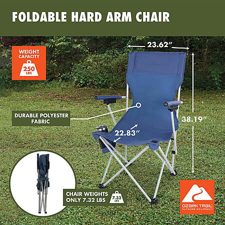The Ozark Trail Hard Arm Chair features a durable polyester seat, strong powder-coated steel frame, and hard armrests for added comfort. It includes a hanging cup holder and folds compactly with a shoulder strap for easy carrying. Ideal for adults, it supports up to 250 lbs and weighs approximately 7.5 lbs. Open dimensions: 22.83"x23.62"x38.19"; closed dimensions: 6.69"x6.5"x39.37". Perfect for camping, outdoor events, or backyard relaxation. Brand: Ozark Trail Built-in carry strap folds the chair quickly for fast and easy transportation Durable powder-coated steel frame with built-in mesh cup holder Weight capacity: 250 lbs Hard armrests for added comfort Compact fold for easy storage and portability