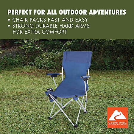 Model: Ozark Trail Hard Arm Chair, Durable Polyester Seat, Strong Steel Frame, Portable with Cup Holder