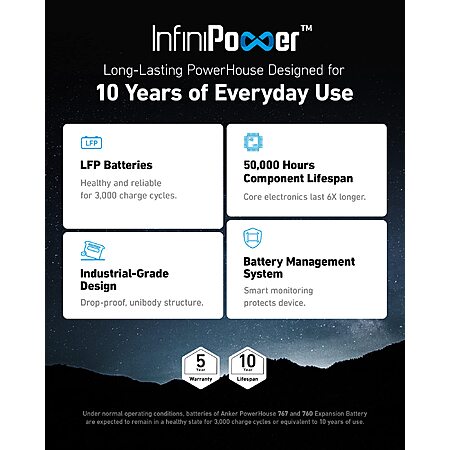 - Long-Lasting Portable Power Station With a 10-Year Lifespan: With our proprietary long-lasting technology InfiniPower, combined with LiFePO4 batteries, ultra-durable electronic components, a smart temperature control system that monitors temperature up to 100 times per second, and impact-resistant structural design, Anker PowerHouse 767 (GaNPrime PowerHouse 2048Wh) and Anker 760 Portable Power Station Expansion Battery (2048Wh) are built to last over a decade, even with everyday use.