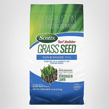 Scotts Turf Builder Grass Seed Sun & Shade Mix with Fertilizer and Soil Improver, Thrives in Many Conditions, 5.6 lbs. $30 AMZ