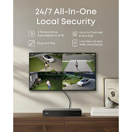 Model: eufy - PoE NVR S4, 24/7 Recording, 16CH, 2TB HDD, 2 Bullet‑PTZ + 2 Bullet, 360° PTZ, AI Tracking, Smart Search, Color Night