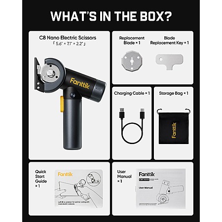 Model: Fanttik C8 Nano 3.7V Cordless Electric Scissors with LED Display, Rechargeable Cardboard Cutter with 2 Blades, EasySwap Blade Change, LED Light, for Thin Cardboard Carpet Leather - Black