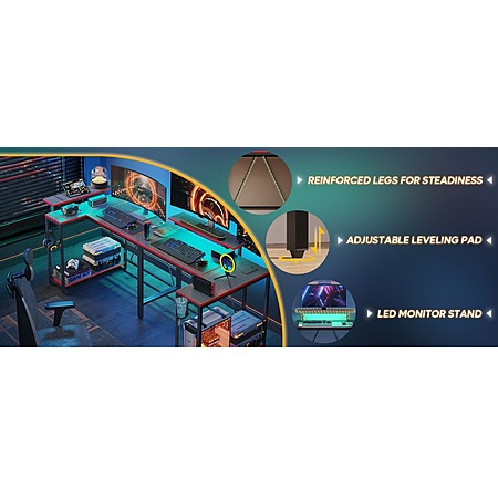 | Product Description: | Pinmoco 42" Reversible L-Shaped Gaming Desk with Monitor Stand, LED Lights& Headset Hooks, Home Office, Carbon Fiber Black is your perfect home office choice.Our L-shaped desk designed with a reversible layout that can be freely combined according to your different needs to maximize space efficiency. This corner computer desk includes an adjustable monitor stand, elevating your screen to eyes level for better posture, make your neck and spine more health. The RGB light strip under the stand, featuring 7 colors and 22 dynamic modes,it's easy to boost your happiness. The spacious 42" desktop offers ample room for essential items. A practical under-desk storage shelf that accommodates files, books, even your PC tower, maintaining a clutter-free workspace. On the side, you'll find a hook for headphones and a foldable cup holder, ensuring easy access to beverages and accessories at your fingertips. Pinmoco furniture collection committed to improving the home experience for all. Click Here ToExplore More For Pinmoco Pinmoco 42" Reversible L-Shaped Gaming Desk with Monitor Stand, LED Lights& Headset Hooks, Home Office, Carbon Fiber Black Ergonomic Monitor Stand: Adjustable monitor stand, elevating your screen to eyes level for better posture, make your neck and spine more health. RGB Lighting: Offering 7 primary colors and up to 20 dynamic modes, let the vibrant lights relax your life, boost your happiness. Reversible and Flexible: Our L-shaped desk designed with a reversible layout, can be freely combined according to your different needs to maximize space efficiency. Multi-Function Storage Space: The spacious 42" desktop offers ample room for essential items. A practical under-desk storage shelf that accommodates files, books, even your PC tower, maintaining a clutter-free workspace. On the side, you'll find a hook for headphones and a foldable cup holder, ensuring easy access to beverages and accessories at your fingertips. Sturdy and Durable: Crafted from premium P2 particleboard, our corner desk blends durability with water and scratch resistance, ensuring lasting quality in any setting. Reinforced Legs and Adjustable Leveling Pads: This practical design can make the desk stay stable in any situation, enhance overall stability and reliability for your workspace. Easy Assembly: Designed for quick and hassle-free assembly, it's easy to put together in 30 minutes. |