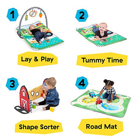 - Extra-large play mat with 4 modes: tummy time, activity gym, barn mode with shape sorter, and road play; Designed by the #1 Manufacturer of Play Gyms (Circana, US dollar sales, Jan-Oct 2023)