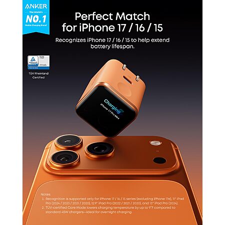 Amazon[amazon.com] has Anker Smart Display Charger, Anker Nano 45W GaN Fast Charging USB C Charger, 180° Foldable Plug, Smart Recognition, Built-in Care Mode, for iPhone17/16/15(Non-Battery,One USB-C Port,No Cable Included), Black on sale for $27.99.