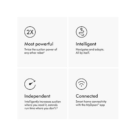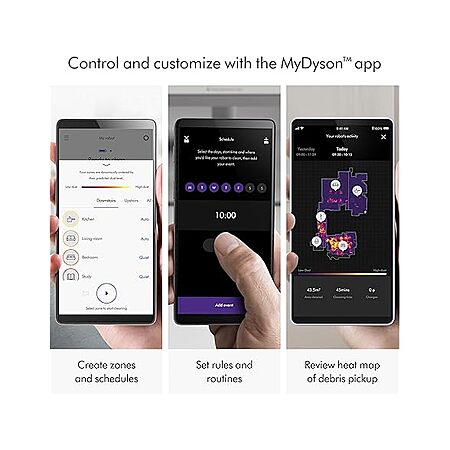 - App control – Connect to the MyDyson app for smart features: mapping, room-specific modes, scheduling, and clean time estimates.