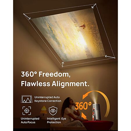 ๏ผProject from wall to ceiling with ease. The 360ยฐ built-in stand and ISA Technology automatically align and adjust the image, giving you the perfect view whether you're lying in bed or relaxing on the couch.
