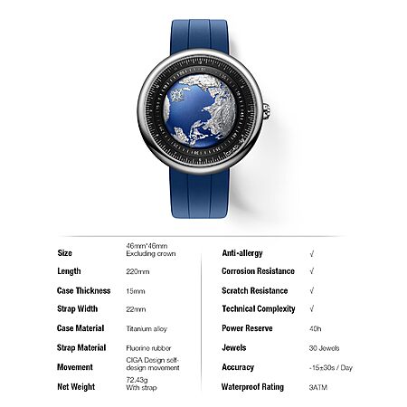 The World on Your Wrist - Inspired by "Blue Marble" the first photograph of Earth as a whole taken from space in 1972. Micro-engraved the earth's terrain on the dial, showing natural elements such as land, mountains and oceans. Unique single pointer design, indicating the time in a way that simulates the rotation of the earth. Means to awaken people's awareness of protecting the earth's environment.