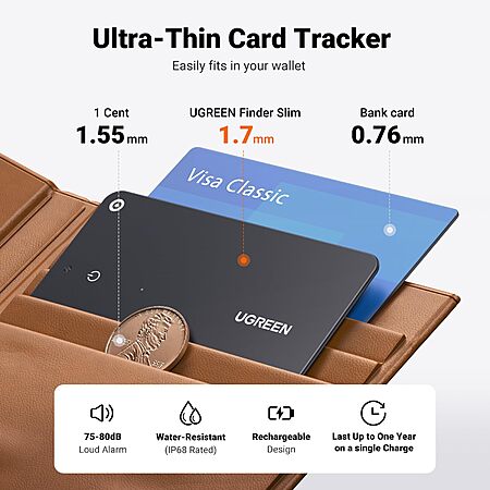 UGREEN GROUP LIMITED via Amazon[amazon.com] has UGREEN FineTrack Slim Wallet Rechargeable Bluetooth Tracker Card (iOS Only, Apple MFi Certified) for $17.99. Shipping is free w/ Prime or on $35+.