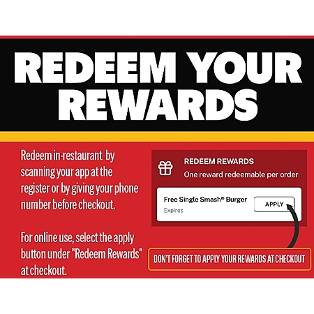 Offer valid only on 3/26/26 to 3/29/26 at US Smashburger retail locations participating in Smashburger Rewards program. Offer is valid for one (1) complimentary burger or Big Dog (not including applicable taxes) when you purchase any burger or Big Dog through your Rewards account. Must have qualifying item in cart for offer to be available. Must have a valid Smashburger Rewards account (subject to terms and conditions) and be signed into the Rewards account to redeem offer. Maximum one (1) BOGO burger or Big Dog offer per Rewards account holder and one (1) offer per transaction.