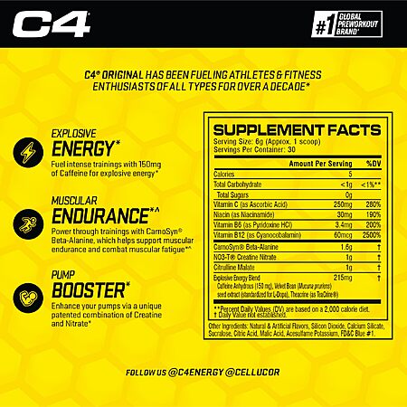 $17.98: Cellucor C4 Original Pre Workout Powder Icy Blue Razz | ZERO SUGAR Preworkout Energy