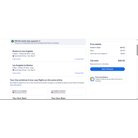 Southwest Airlines and Expedia have round trip airfares travelling to and from Boston (BOS) and Los Angeles (LAX) for $182, making 1 stop both ways. Stopover city and duration depend on the flight you choose. These are basic economy fares that allow a personal item and a carry-on bag. There is no seat selection and no change.