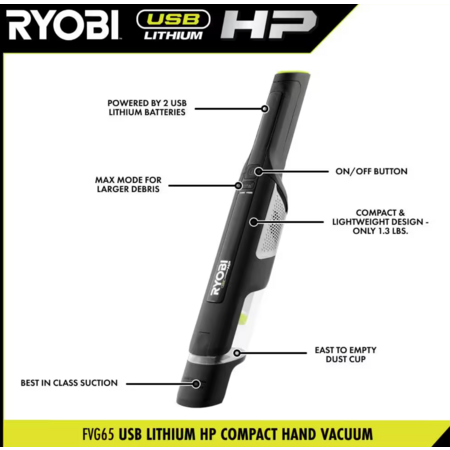Ryobi USB Lithium HP Compact Hand Vacuum Cleaner Kit with (3) USB Lithium 2.0 Ah Batteries and Charger - $79.98 at Home Depot