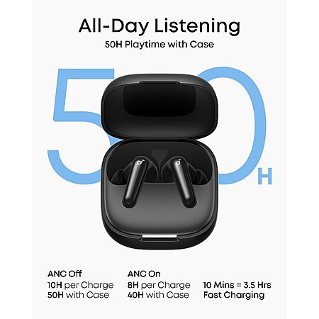 - Ultra-Long Playtime & Fast Charging: Enjoy up to 10 hours of playtime on a single charge (50 hours with the case). Even with ANC on, get 8 hours per charge and 40 hours total. A quick 10-minute charge gives 3.5 hours of listening.