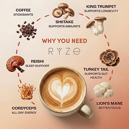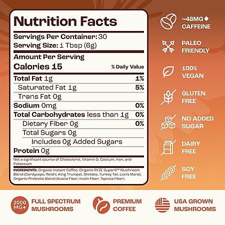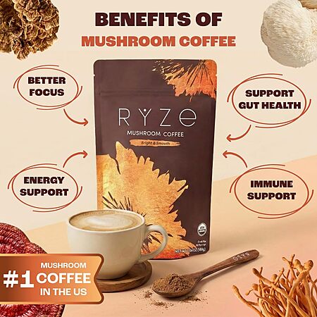 $38.24: RYZE SUPERFOODS Mushroom Medium Roast Coffee USDA Organic with 6 Adaptogenic Mushrooms, USA Grown Instant Coffee