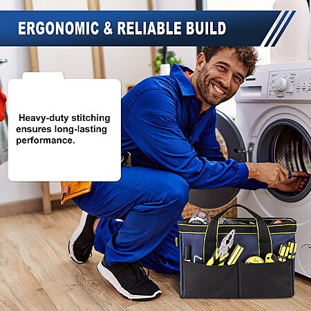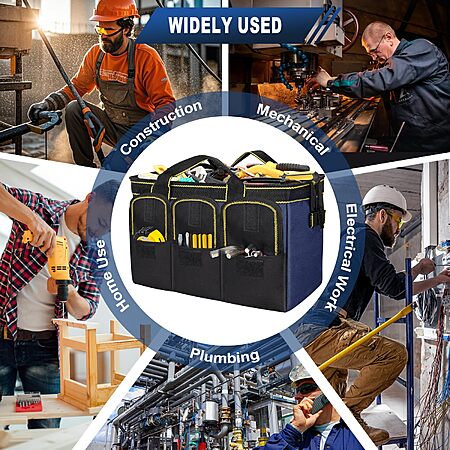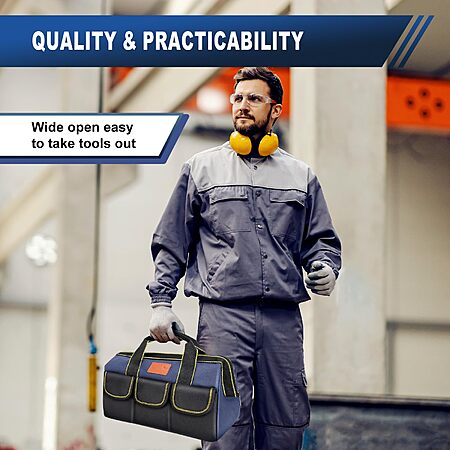 Model: MORROWIND 12-Inch Tool Bag with Waterproof Hard Bottom, Durable Wide Mouth Tote Tool Organizer with Multiple Pockets for Electricians Carpenters Mechanics and DIY Projects, Blue