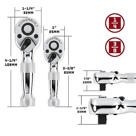 Model: Powerbuilt Stubby Ratchet Set, 2 Piece, 1/4 Inch and 3/4 Inch Ratchets, Reversible 72 Tooth, Tight Spaces, Quick Release - 640927