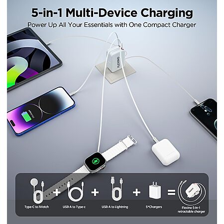 • [5-in-1 Retractable Wall Charger] The 5-in-1 retractable wall charger combines three built-in retractable charging cables, each extending up to 37.44 inches, with one USB-C port and one USB-A port, allowing up to five devices to charge simultaneously from a single outlet for daily use.
