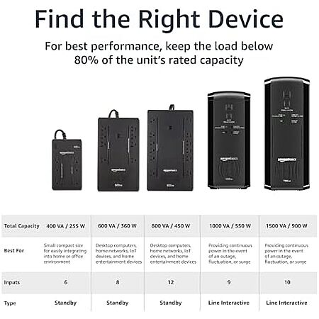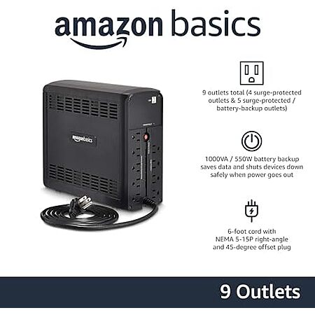 Model: Amazon Basics Line-Interactive UPS 1000VA 550 Watt Surge Protector Battery Power Backup, 9 Outlets - Black