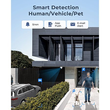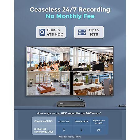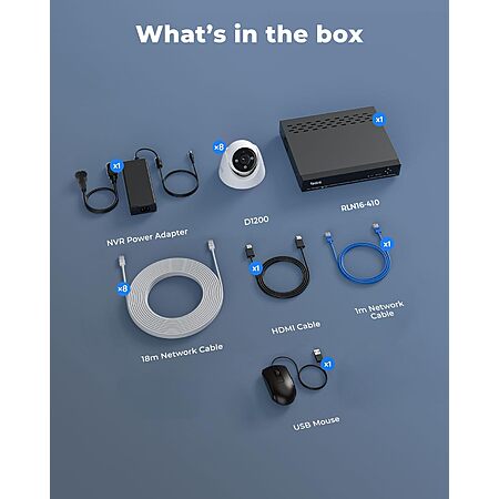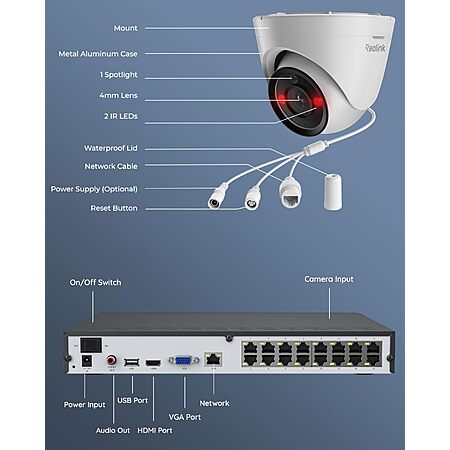 The REOLINK RLK16-1200D8-A is a high-resolution 12MP PoE security system that includes 8 wired cameras and a 16-channel NVR with a pre-installed 4TB hard drive. It supports smart detection for people, vehicles, and pets, helping reduce false alerts, along with two-way audio for communication. Color night vision with built-in spotlights improves visibility in low-light conditions, while PoE connectivity simplifies installation with a single cable for power and data. Overall, it's a feature-rich system suited for home or small business surveillance, offering strong image clarity and storage capacity, though installation requires running Ethernet cables and some initial setup.