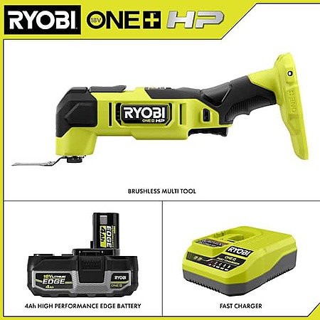 | Product Description: | The next generation RYOBI 18V ONE+ HP Brushless Oscillating Multi-Tool is the most powerful multi-tool in the RYOBI lineup, delivering up to 80% faster cutting and 2.5X more cuts on a single charge when cutting through material like wood, drywall, plastic, and metal. RYOBI 18V ONE+ HP Technology delivers more power, runtime, durability and speed utilizing brushless motors, advanced electronics and HIGH PERFORMANCE lithium technology. A 3.8 oscillation angle gives this tool the power for demolition and its variable speed dial enables speeds from 10,000-20,000 OPM providing control in detailed applications. Eliminate fatigue with the on-board lock-on button during extended tasks. And when working in dimly lit areas, use the LED work light to illuminate your space. This tool converts to a detail sander with the included sanding pad and can even remove grout with a grout blade, giving you the ability to complete multiple tasks with just one tool. Utilize the tool-free accessory change to quickly switch between the included blades and sanding pad with little downtime. Best of all, it is part of the RYOBI ONE+ system where any 18V ONE+ battery works with any 18V ONE+ product. This 18V ONE+ HP Brushless Multi-Tool Kit is backed by the RYOBI 3-year manufacturer’s warranty and includes 18V Brushless Multi-Tool, 18V 4Ah Lithium HIGH PERFORMANCE EDGE Battery, 18V Charger, Plunge Cut Blade, Flush Cut Blade, Sanding Pad, 3 pcs. Sandpaper and Operators Manual’s. |