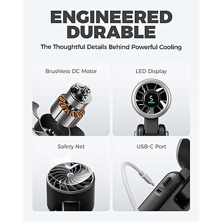 Ultra Powerful Wind, Rapid Cooling: Stay cool on the go with the JetForce handheld turbo fan! Featuring Aero-Turbojet technology, a high-speed three-phase brushless motor, and a 5-blade design, this handheld fan delivers a maximum wind speed of 10m/s—3x more powerful than general fans.