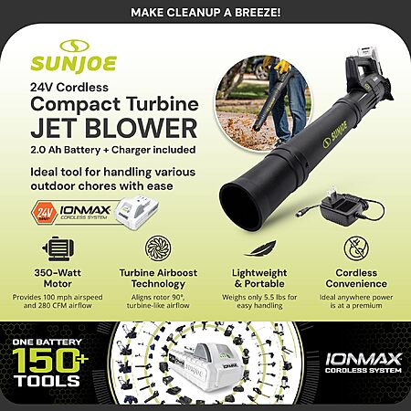 Sun Joe 24V Cordless IONMAX Compact Turbine Jet Blower $55.98 & More + Free Shipping