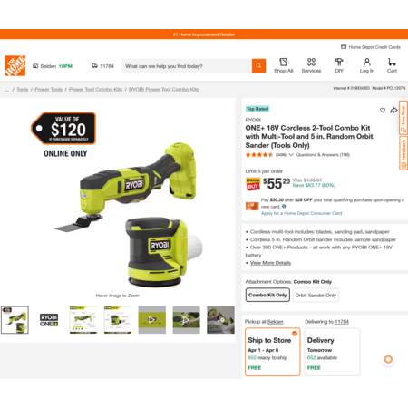 RYOBI ONE+ 18V Cordless 2-Tool Combo Kit with Multi-Tool and 5 in. Random Orbit Sander (Tools Only) $55.20