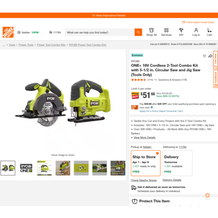 RYOBI ONE+ 18V Cordless 2-Tool Combo Kit with 5-1/2 in. Circular Saw and Jig Saw (Tools Only) $51.66