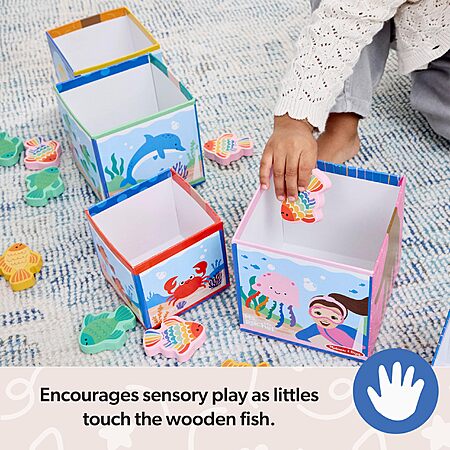 - Grasping the fun wooden fish play pieces, dropping them into and retrieving them from the "fish tanks," stacking, and (of course!) knocking down the blocks encourages small and large muscle development