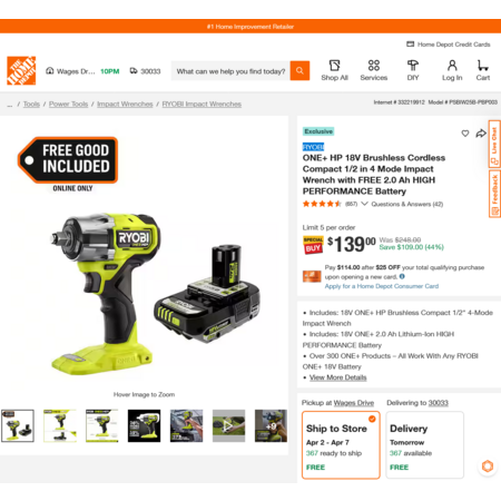RYOBI ONE+ HP 18V Brushless Cordless Compact 1/2 in 4 Mode Impact Wrench with FREE 2.0 Ah HIGH PERFORMANCE Battery $139