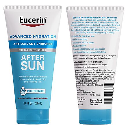 - Rehydrate sun-soaked skin with Eucerin Advanced Hydration After Sun Lotion. Formulated with antioxidants (Licochalcone A, Glycyrrhetinic Acid and Vitamin E) and shea butter, this hydrating lotion soothes and immediately helps hydrate dry, sun-stressed skin. This ultra-lightweight dry skin lotion delivers long-lasting, 24-hour moisture and a fresh, cool feeling to the skin with no greasy feeling. Eucerin Advanced Hydration After Sun Lotion is non-comedogenic (won't clog pores) and is suitable for all skin types including sensitive skin. Also hypoallergenic, this face and body lotion for dry skin is free of parabens, dyes and phthalates. To use, smooth this after sun body moisturizer over your skin generously after sun exposure and reapply as needed whenever your skin feels dehydrated for the ultimate after sun skin care routine. Pair Eucerin After Sun Lotion with our Eucerin Advanced Hydration Sunscreen Lotion.* Eucerin is a dermatologist-recommended skincare brand that is based on an uncompromising approach to science. *Use and reapply as directed with other Sun Protection Measures (See Drug Facts Box) One 6.8 fluid ounce tube of Eucerin Advanced Hydration After Sun Lotion; After sun moisturizing lotion helps soothe and hydrate dry, sun-stressed skin; Enriched with antioxidants (Licochalcone A, Glycyrrhetinic Acid and Vitamin E) and shea butter; Ultra-lightweight after sun moisturizer leaves a fresh and cool feeling on skin without being greasy or sticky; This after sun care lotion is suitable for all skin types including sensitive skin;