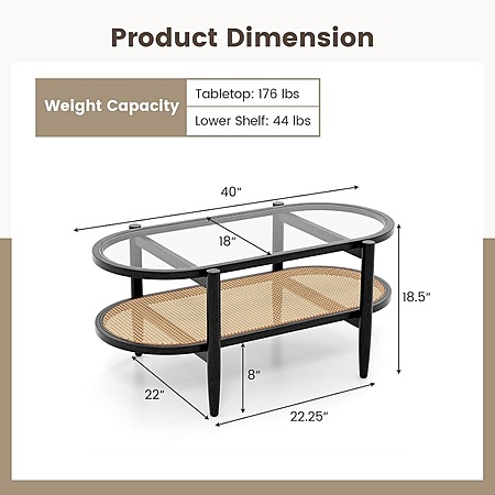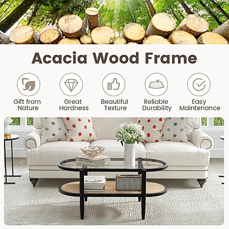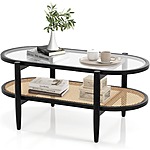 2-Tier 40'' L Boho Oval Acacia Wood Cocktail Table/Rattan Coffee Table with Tempered Glass Tabletop and PE Rattan Storage Shelf $79.19 + Free Shipping