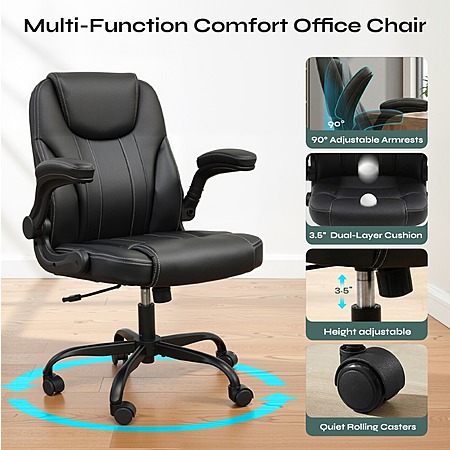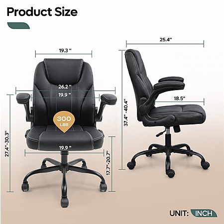| Product Description: | The Pinmoco Ergonomic Office Chair delivers ultimate comfort. Designed for extended periods of sitting, this chair offers superior lumbar support, conforms to the body's curves, and effectively relieves back and lower back pain. This stylish executive office chair is upholstered in premium, scratch-resistant synthetic leather. Adjustable seat height, backrest angle, and armrests ensure maximum comfort and relaxation. The included instructions and tools make assembly easy and simple. Durable and smooth-rolling, this chair is ideal for your home or office. Ergonomic Comfort & Support: This office chair is equipped with a thick padded headrest and ergonomic lumbar support, effectively aligning your spine and relieving fatigue during long working hours. The double-layered seat cushion retains its shape for consistent, long-lasting comfort. Breathable mesh side panels enhance air circulation and keep you cool by preventing sweat buildup. Flexible Flip-Up Armrests: Easily flip the padded armrests up to save space when not in use, or lower them for full upper body support—ideal for typing, gaming, or relaxing. Modern Minimalist Design: Elevate your workspace with a sleek, contemporary silhouette that complements any modern desk or home office decor, a refined alternative to outdated quilted office chairs. Premium PU Leather & Easy Maintenance: Built with high-quality, scratch-resistant and water-resistant PU leather that's effortless to clean while maintaining a luxurious look year after year. High Quality Build: Heavy duty rubber wheels that are smooth and silent on a variety of floors and won't scratch your floors. The office chair uses SGS certified level 3 gas lift, with a weight capacity of 275 lbs., suitable for most big and tall people. Quick Assembly & Reliable Support: Includes clear instructions and tools for 20-minute setup, backed by responsive customer service for worry-free ownership. |