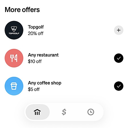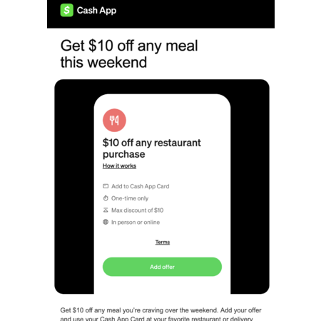 I just got an email titled "Get $10 off your next meal" from Cash App by Square. Went over to Cash App on my phone, and saw the other offer for $5 off coffee shops too.