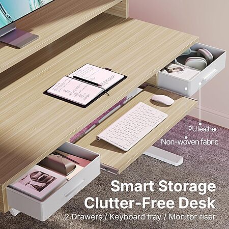 • Comfortable & Organized Workstation: With a design that maximizes legroom — this desk lets you sit and move comfortably without bumping your knees. The deeper desktop and two drawers offer plenty of storage for office supplies, helping you create a tidy and multitask-friendly environment.
