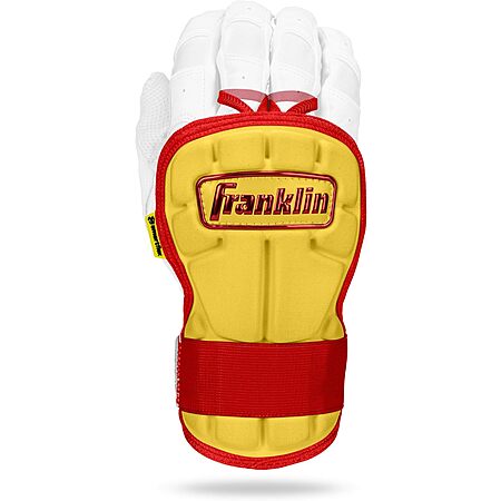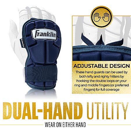 - Protect yourself at the plate with Franklin Sports' PRT LG Baseball Hand + Wrist Guard! Give yourself confidence and peace of mind when you step into the batter's box with this protective hand and wrist shield. With so many small and fragile bones in the hand, hit-by pitches can be costly in terms of pain and injury. This hand and wrist protector pad is designed to absorb the force of the impact to reduce the likelihood of injury. This adjustable baseball hand guard is easy to strap on and is designed to be sleek and comfortable so it won't impede your swing. The soft-shell protector hardens on impact to lessen the damage caused by the ball and gives players added confidence during their at-bat. The LG Hand and Wrist protector also offers double the coverage of other hand guards on the market by extending down the wrist for additional protection. Designed to be sleek and lightweight, this hand guard is designed to fit comfortably for both right hand and left hand hitters. Plus, over time, the flexible interior shell will mold to the shape of your hand for a unique, comfortable fit. So step to the plate with ultimate confidence and protection for your next at bat and grab your PRT LG Baseball Hand + Wrist Guard today!