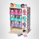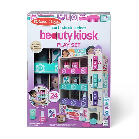 The Melissa & Doug Sort, Stock, Select Beauty Kiosk Play Set lets kids sort pretend play beauty items by color (DOES NOT CONTAIN REAL NAIL POLISH OR OTHER COSMETICS), stock the wooden vending machine, then insert play coins and make a selection by pressing the corresponding button so items fall into the collection drawer