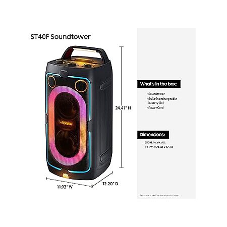 Woot! has (NEW) SAMSUNG ST40F Sound Tower Portable Party Speaker with Built-in Battery, Bluetooth, IPX4 Splash Resistant, Directional Sound, Up to 12 Hours Battery Life for $223.5.