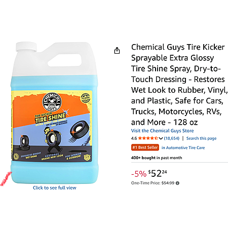 Chemical Guys Tire Kicker Sprayable Extra Glossy Tire Shine Spray, Dry-to-Touch Dressing - Restores Wet Look to Rubber, Vinyl, and Plastic, Safe for Cars, Trucks, Motorcycles, RVs, and More - 128 oz